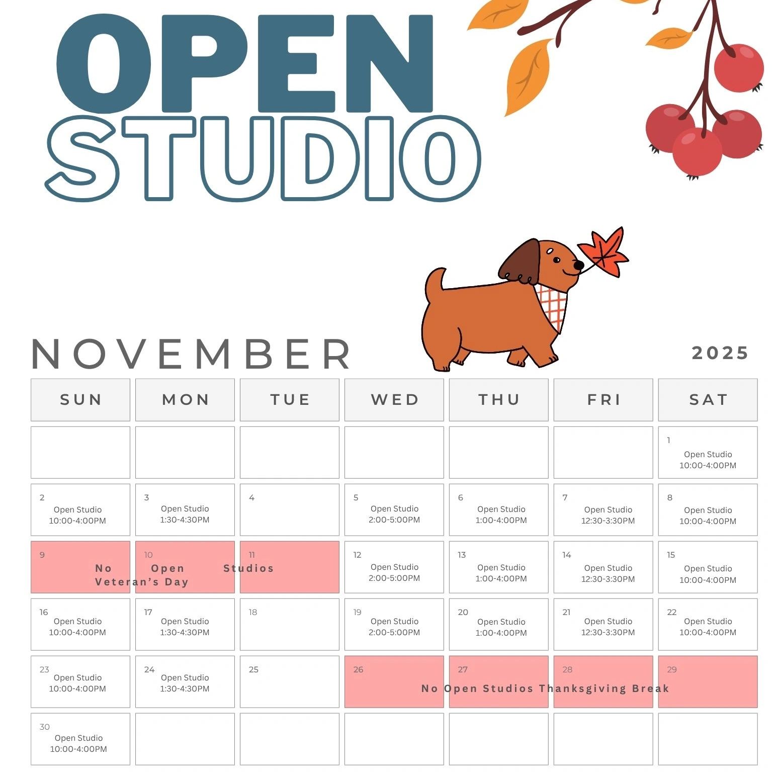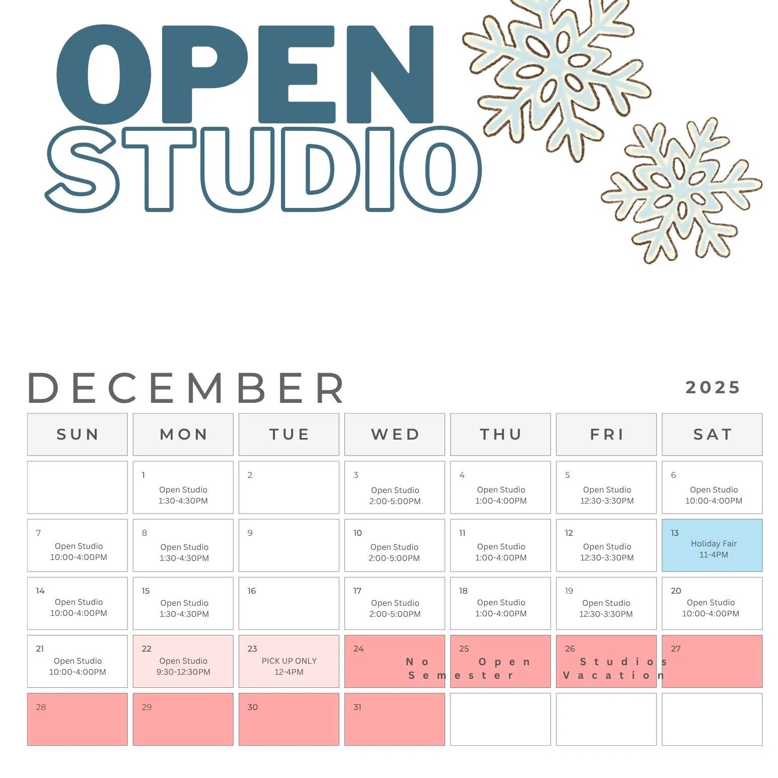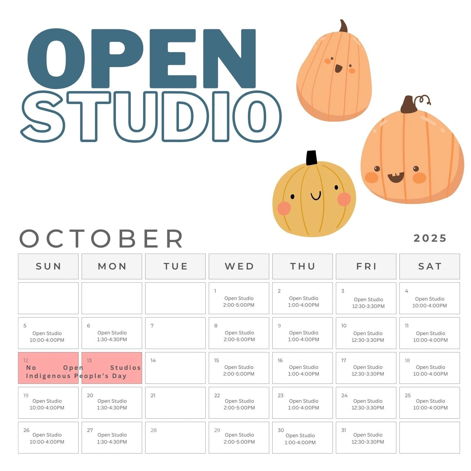 Please note that we may be closed for major holidays and private events. Check the calendar below for any changes in open studio hours
